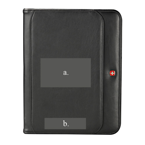 Front organizational pocket. Interior organizer features innovative snap-back business card/ID card holder, two business card pockets, documents pocket, small organizational pocket, pen loop, and three elastic organizational storage loops for USB holder memory drives, writing instruments, etc. Includes an 8.5" x 11" lined notepad and gift box. 13.5" x 10.63" x 1.5". Custom debossed personalization is available—your name, initials, monogram, or a seal or logo. Available in black.